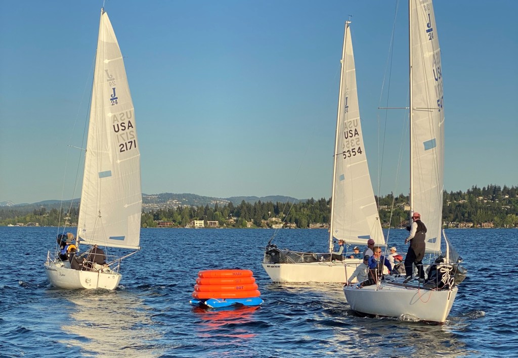 Sailboat racing is a popular pastime on the waters around Seattle and Western Washington. Especially during summer, fleets of sailboats congregate on weeknights and weekends for organized races, often using inflatable buoys temporarily anchored to indicate the race course.